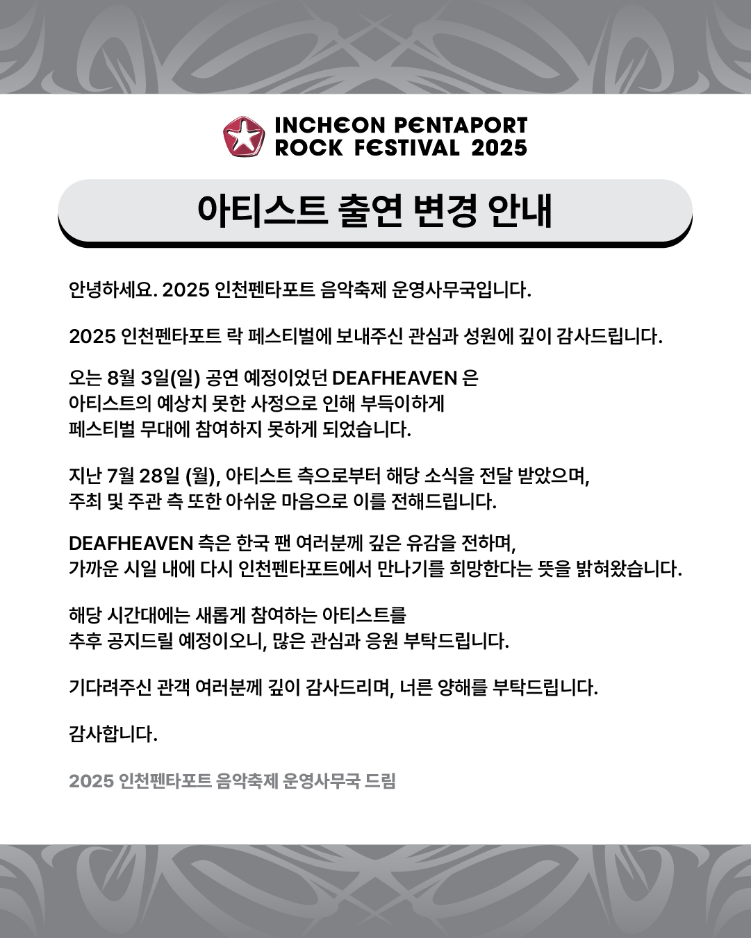 DEAFHEAVEN 측은 한국 팬 여러분께 깊은 유감을 전하며,