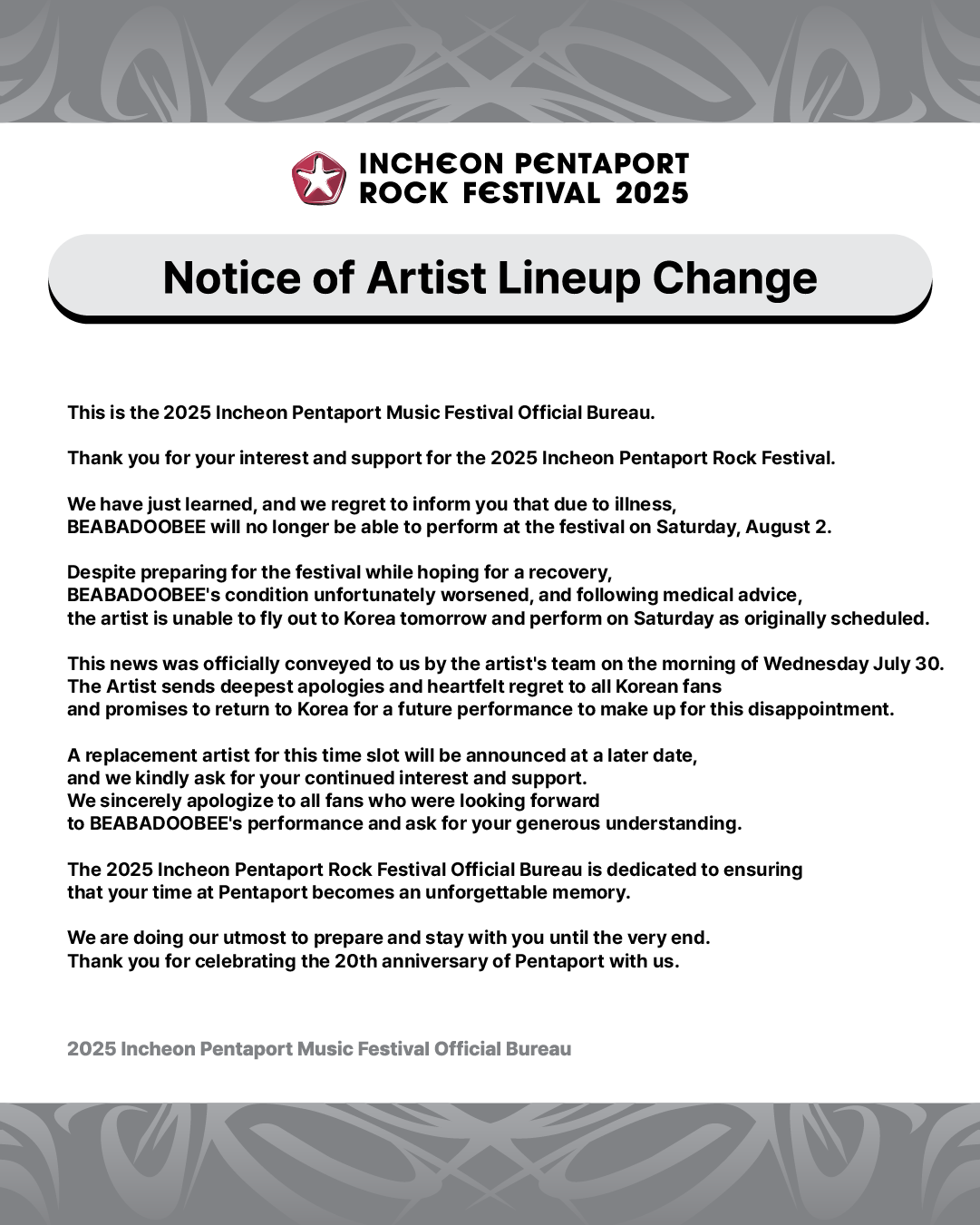 [2025 PENTAPORT] 아티스트 출연 변경 안내