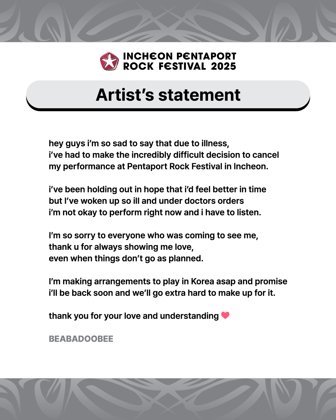 Despite preparing for the festival while hoping for a recovery, BEABADOOBEE's condition unfortunately worsened, and following medical advice, the artist is unable to fly out to Korea tomorrow and perform on Saturday as originally scheduled.
